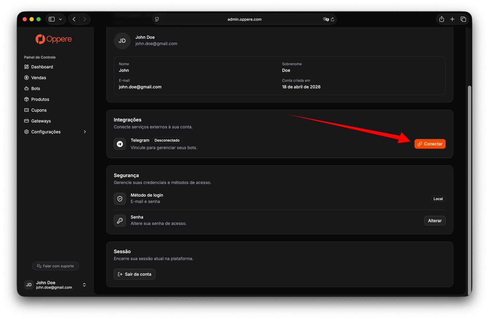 Antes de criar o bot dentro da Oppere, você precisa vincular a sua conta do Telegram ao painel.