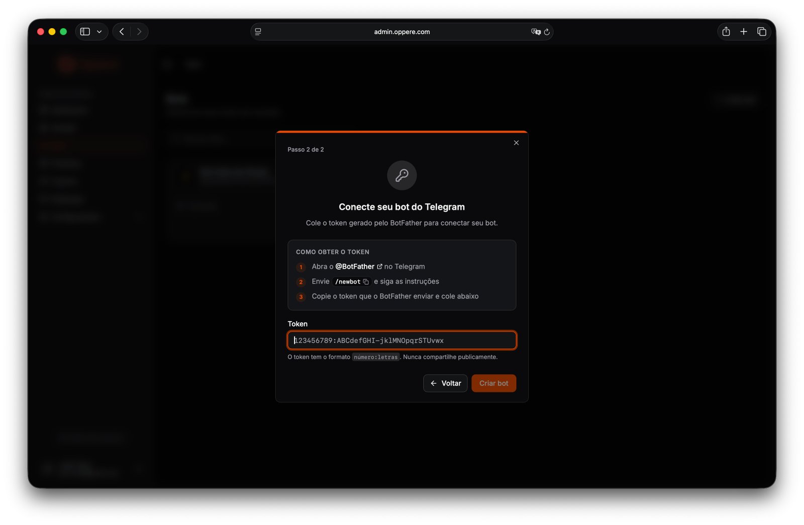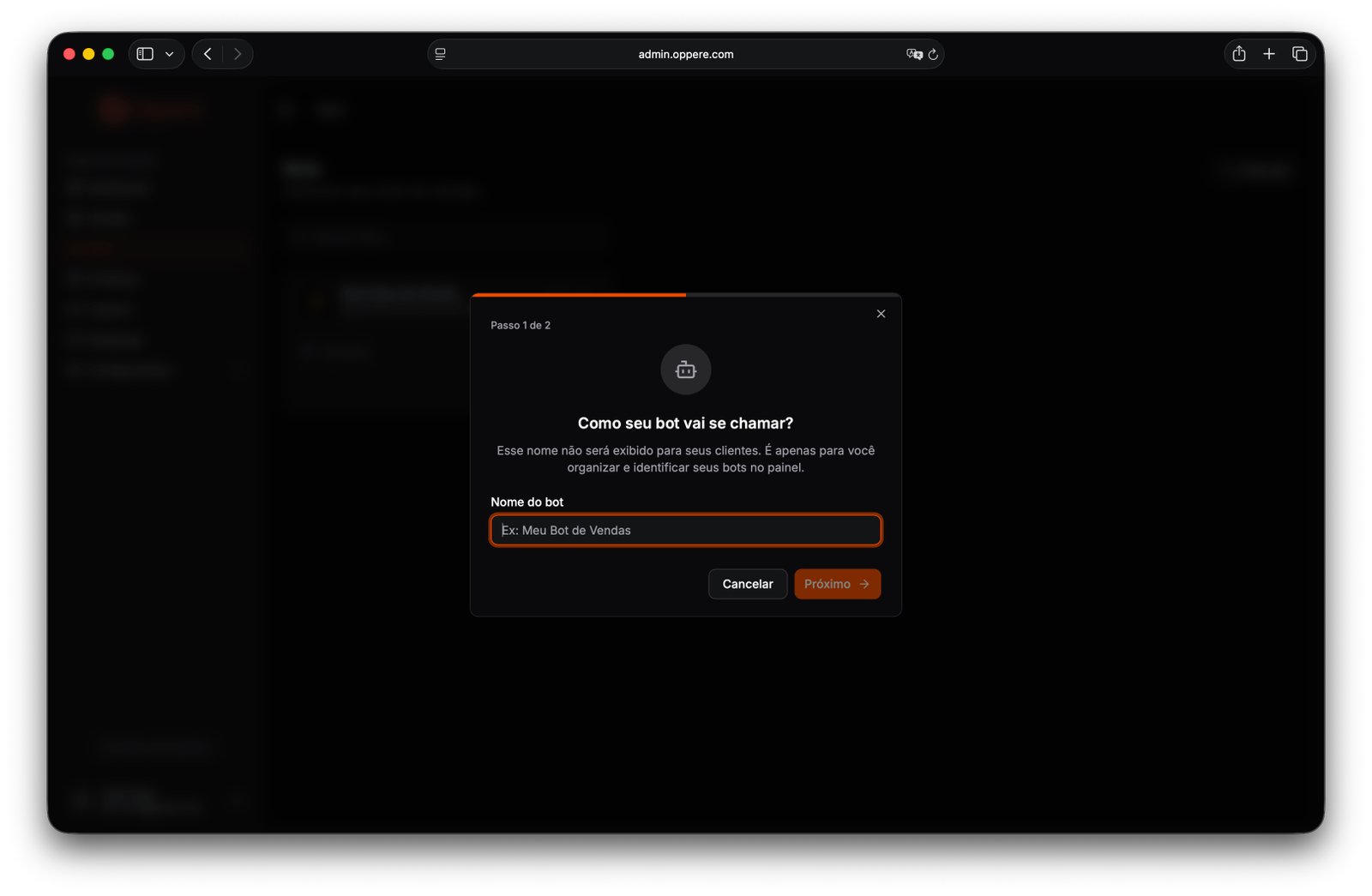 1. Acesse admin.oppere.com/bots e clique em Criar bot. O painel abre um modal que te conduz em dois passos.