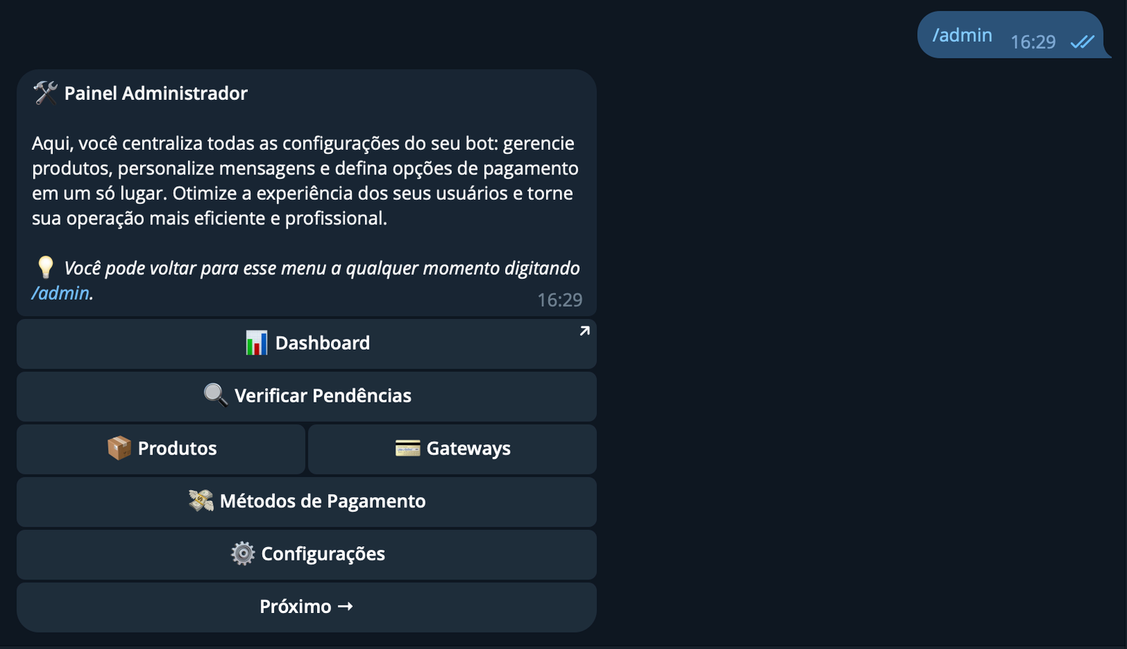 A partir daqui você tem acesso a todas as configurações: produtos, planos, mensagens, gateways, cupons, remarketing, idiomas. Vamos configurar o essencial para o bot sair vendendo.