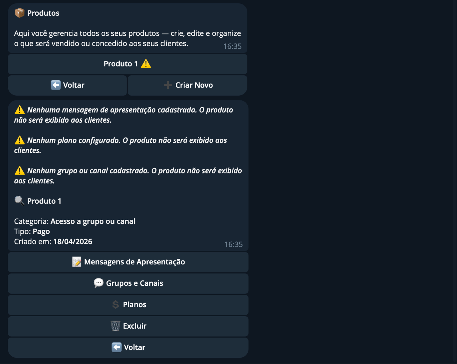 O produto é criado, mas entra com um aviso de pendências antes de ficar disponível para venda: você ainda precisa configurar a mensagem de apresentação, pelo menos um plano e o conteúdo em si — vincular um grupo ou canal ou cadastrar pelo menos uma mídia, conforme o tipo do produto que você escolheu.