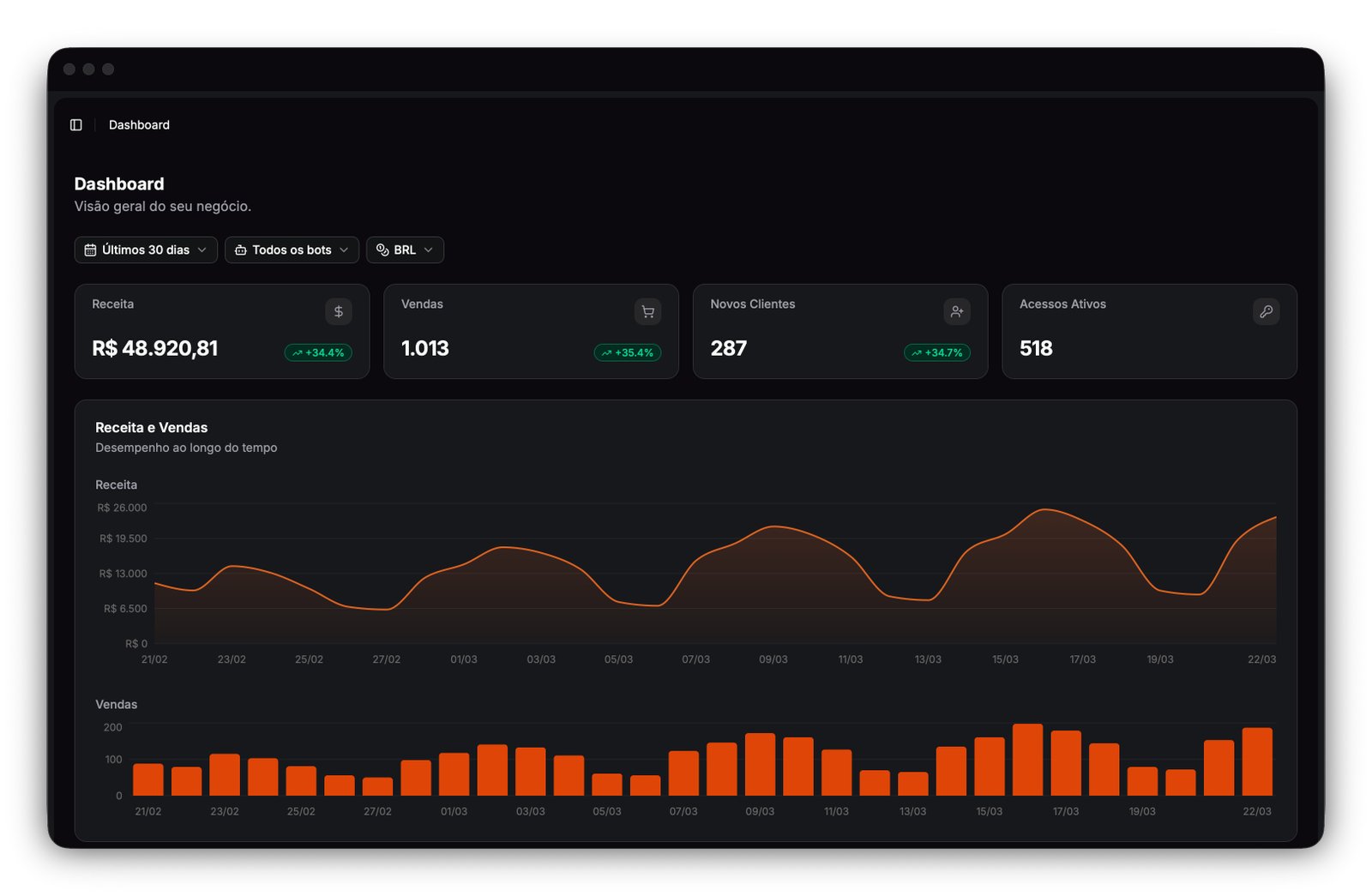 Na primeira vez que você entrar, o painel vai estar vazio — nenhum bot, nenhuma venda, nenhum produto. É o próximo passo que começa a resolver isso.